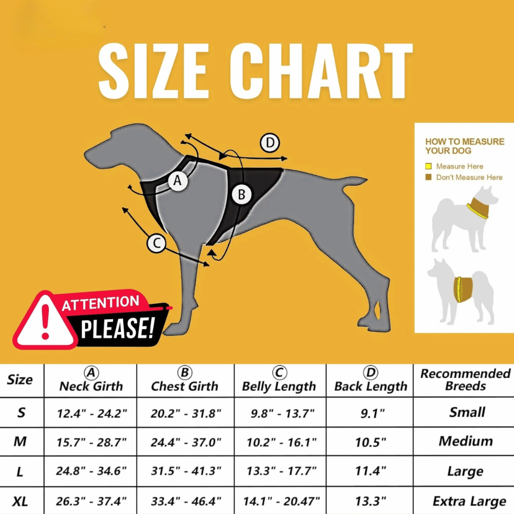 FULLY ADJUSTABLE DESIGN - 4 Lockable buckles on the chest and neck for easy on & off. Five adjustment points firmly fix the harness for the snug fit. The belly point prevents the harness from rubbing along your dog's armpits. Giving plenty of room to expand as your fur baby grows